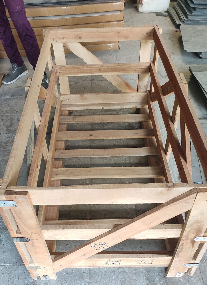 Eventually, the crate is sealed by fixing the upper part using nails. Another layer of polythene sheet is used from the outside to prevent exposure to the sun, water, and cold. Packaging straps are used to secure the crate from all sides.